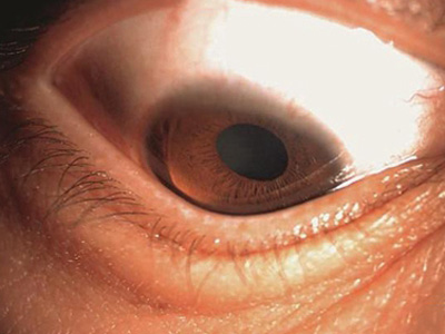 圆锥角膜患者的角膜出现异常的变形,类似于弧度较大的圆锥形,角膜中间稍稍突起,从正面看时会发现瞳孔被变形的角膜折射为类椭圆形。