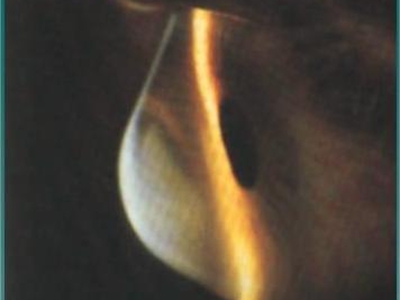 圆锥角膜患者眼球右侧有一个凸起变形,呈现锥形扩张,裂隙灯显微镜下角膜明显变薄,角膜基质变薄区在圆锥的顶端最明显,初期能用近视镜片矫正。