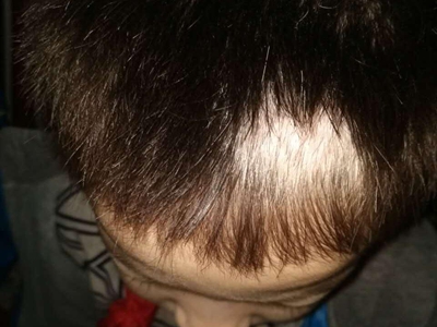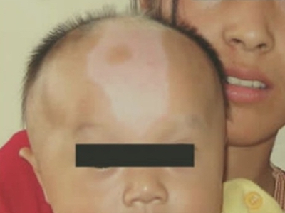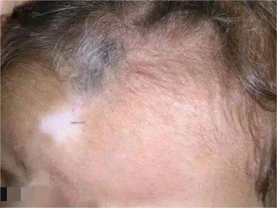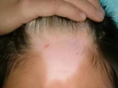 斑驳病表现为患者额头中央或稍偏部位出现倒三角或菱形白斑,边界清晰,明显区别于正常皮肤,病损部位的头发与正常头发无异,只是颜色由黑色变为白色。