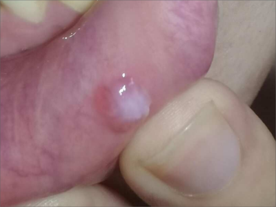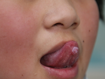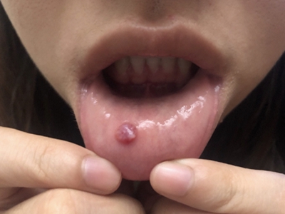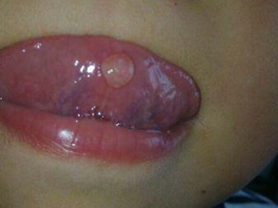 外渗性黏液囊肿患者的舌头近舌尖部位出现一个黄豆大小的圆形疙瘩,明显突出于正常舌面,质地柔软,疙瘩破溃后流出黏稠的白色液体,且反复发作。