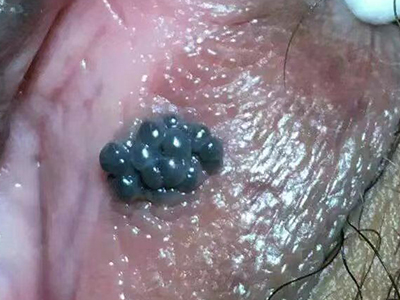 外渗性黏液囊肿患者的小阴唇上出现簇集分布的黑色小疙瘩,疙瘩表面光亮,如小米粒大小,颜色为黑色,囊内含有囊液,质地柔软,伴有触痛感。
