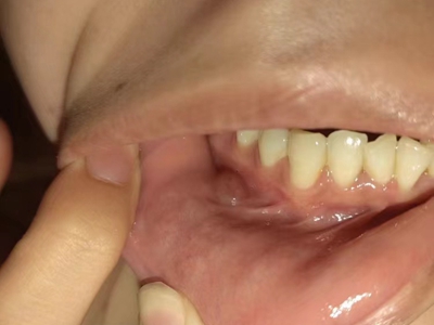 外渗性黏液囊肿表现为患者下面的右侧牙龈上有一个红疙瘩,相对较大,有异物感,与周围的皮肤颜色相似,表面光滑,此病是由于局部创伤、导管系统阻塞等导致。