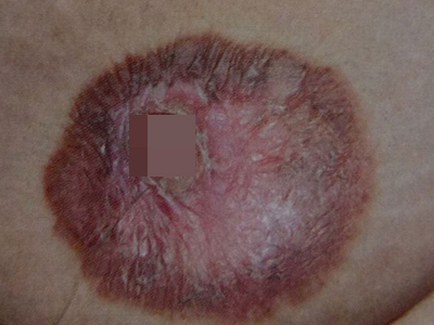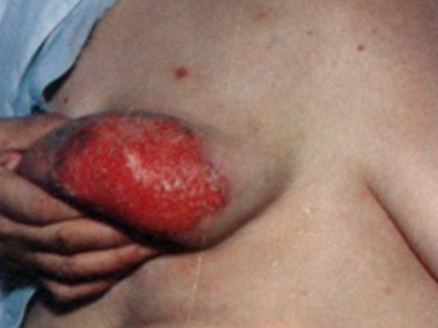 乳房湿疹样癌主要累及女性,好发于单侧乳房和乳晕部,平均发病年龄为55岁,罕见于男性乳房。皮损初发为鳞屑性红斑或斑块,常伴有湿疹样变,呈表浅糜烂、渗出或结痂,浸润明显,缓慢向周围扩大,可形成溃疡和乳头回缩。常伴发乳腺癌,可有腋窝淋巴结转移。