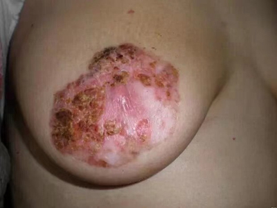 乳房湿疹样癌的皮损通常是从单侧乳房的乳头开始,逐渐累及乳晕及周围,初期为类圆形红斑,红斑上会逐渐出现糜烂、渗出、结痂甚至溃疡。