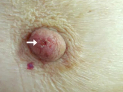 乳房湿疹样癌初期,患者一侧乳头的顶端乳孔处破溃,形成红色出血点,血性液体渗出,并形成红色结痂,后续会向周围扩散,但病变发展速度较慢。