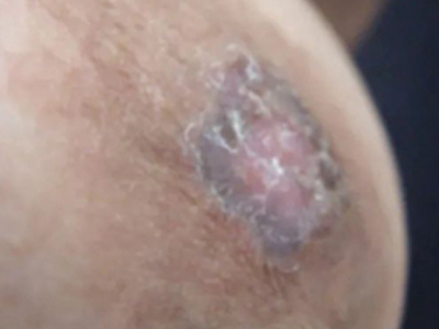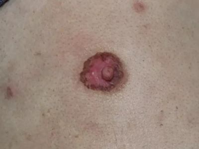 乳房湿疹样癌偶见于男性患者,皮损表现为一侧的乳头和乳晕出现红斑,红斑上会逐渐出现湿疹样改变,包括糜烂、渗出、结痂,甚至溃疡。