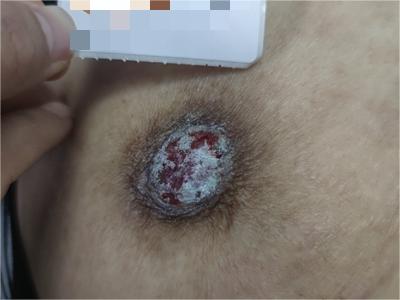 乳房湿疹样癌患者右乳房以乳头为中心出现拳头大小的红斑,红斑边界清楚,形状为类圆形,红斑表面破溃渗出,结成黄褐色厚痂,乳头受到累及,形态已经不完整。