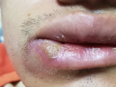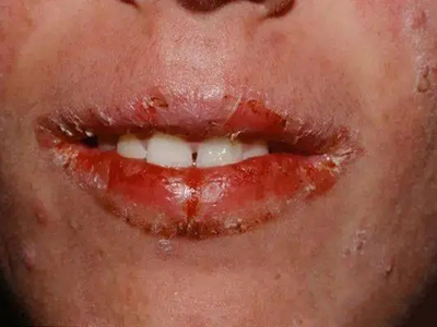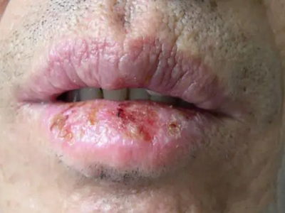 慢性唇炎下嘴唇出现大面积溃烂,有渗液,渗液表面结痂,基底仍有渗液被结痂包裹,暂未流出,结痂下的唇面红肿明显,伴有疼痛,随着病情发展,可能会引发继发感染。