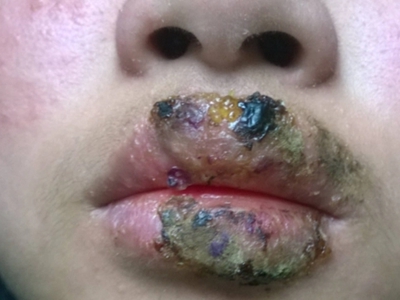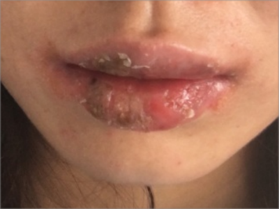 慢性唇炎上下嘴唇出现大面积渗液,经过干燥后大部分结成黄痂,小部分结成黑痂,基底部分仍有些湿润,上嘴唇中间还有一簇黄色水疱,暂未破裂。