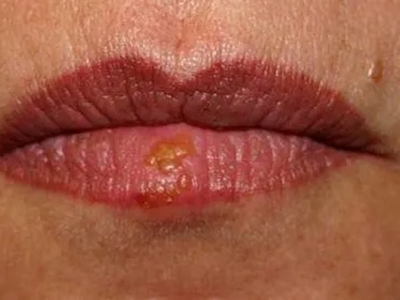 慢性唇炎下嘴唇有一块扁豆大小的溃疡,形状不规则,上有黄白色结痂,突出于皮肤表面,摸起来质硬且粗糙,伴疼痛,影响美观,不易治愈。