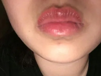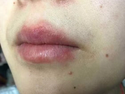 慢性唇炎导致患者的上下嘴唇明显肿胀、发红,与原本的嘴唇相比显著增厚,看起来类似香肠嘴,并且嘴唇上还有大片的痂皮和鳞屑脱落。