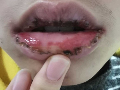 慢性唇炎儿童上下嘴唇均出现干燥状况,下嘴唇干燥较为明显,唇面附着白色鳞屑,还有少量结痂,嘴角出现裂口,结有血痂,周围皮肤发红。