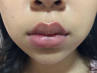 慢性唇炎上下嘴唇明显肿胀,较原本的嘴唇更厚,患者可自觉有唇部紧绷感、烧灼感,注意纠正舔唇陋习,配合使用激素类药物消炎消肿。