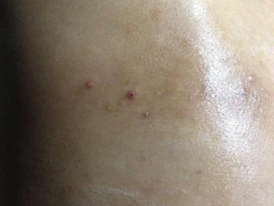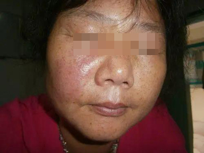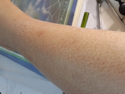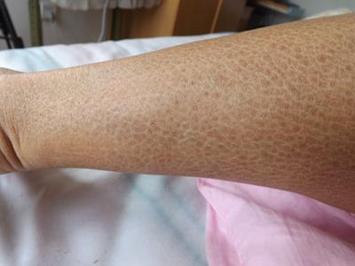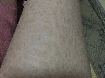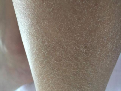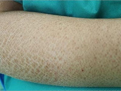 之后出现皮肤干燥,轻型病例见于青年人,常发生于胫前、背部等处出现沿皮肤切线排列的龟裂纹,称镶嵌皮肤或裂纹皮肤,伴皮肤色素沉着、浅表脱屑。严重病例有大片皮肤侵袭,以及出血点、大疱、溃疡和坏死,皮肤易受伤。