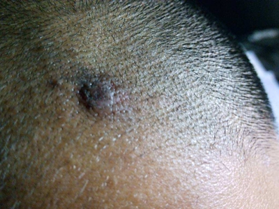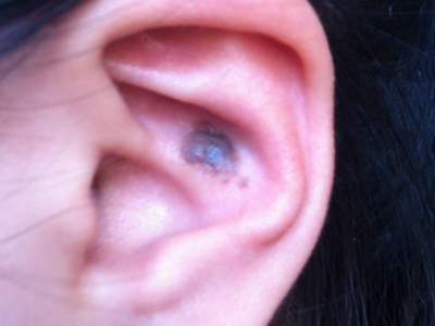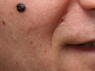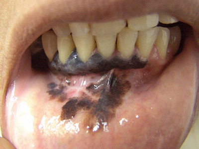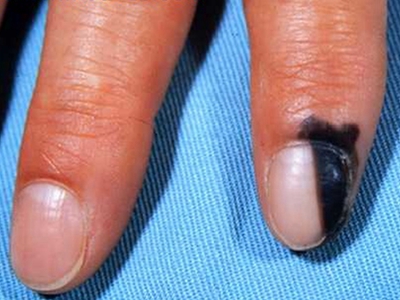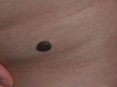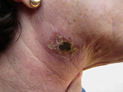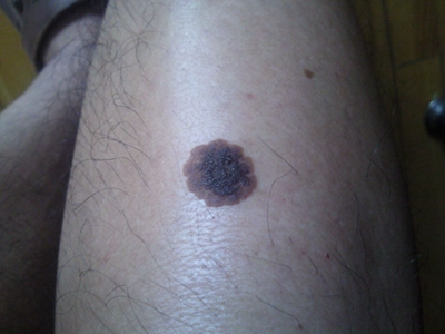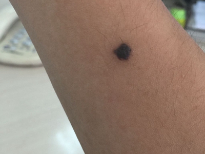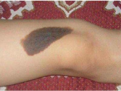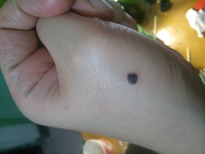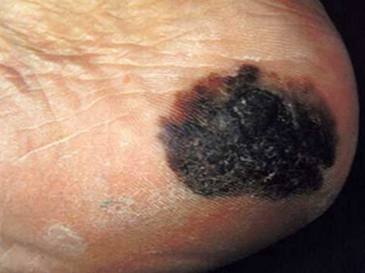浅表播散型黑色素瘤广泛发作于各类成年人群,皮损为各种形状,边缘不规则,色泽不一,呈黑色、红色、褐色、蓝色和白色。病变早期,先沿着表皮呈水平方向扩展,表现为皮损不对称性增大,在其边缘外侧出现小的类似损害,此期大概维持1-5年之后垂直生长,即向真皮深层或皮下脂肪层浸润。但在皮损的早期就常表现出恶性特征,如易出血、糜烂和溃疡等。
