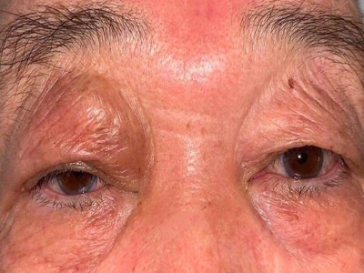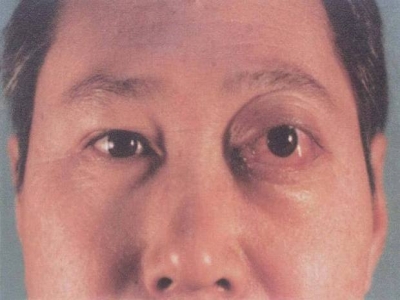 眼眶海绵状血管瘤发生在左眼上眼眶,会出现一个肿起的包块,上眼睑下垂严重,眼睛不能正常睁开,影响面部美观度,是先天发育异常所致。