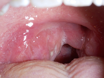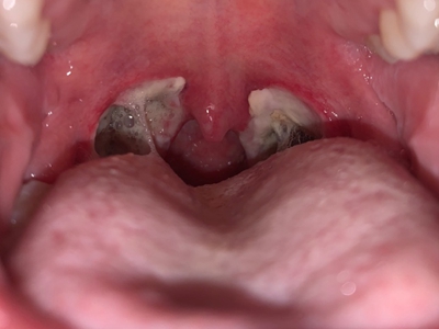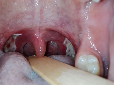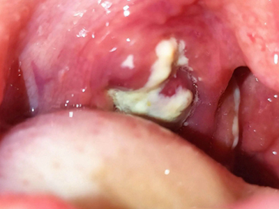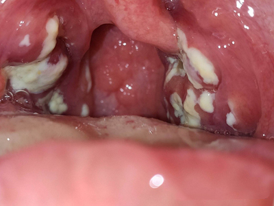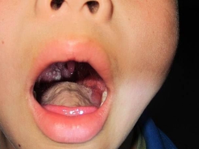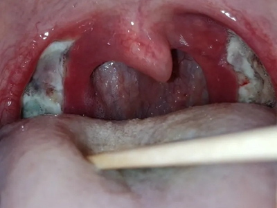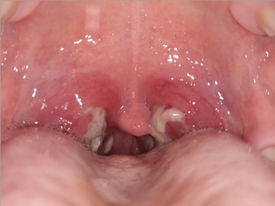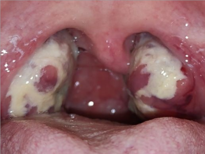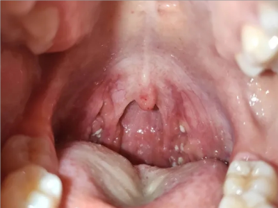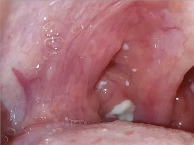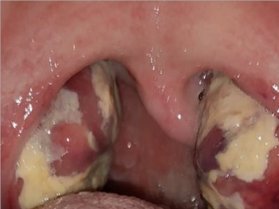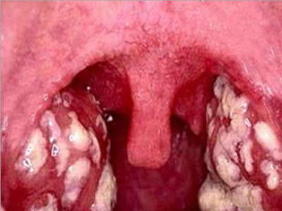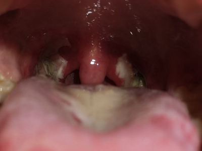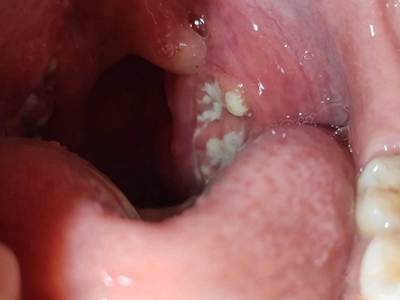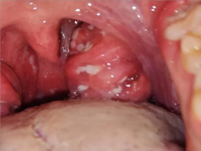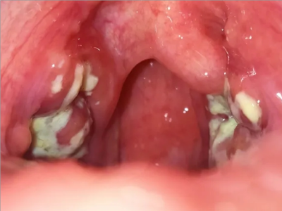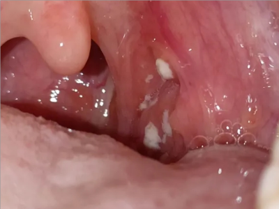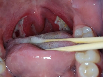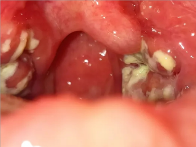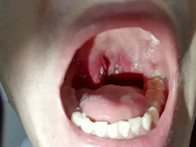 化脓性扁桃体炎咽喉部出现厚厚的脓苔图