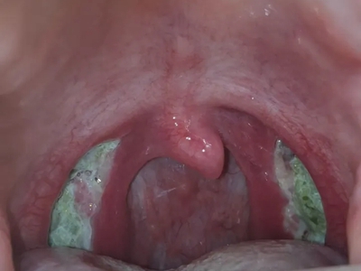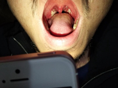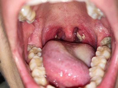 化脓性扁桃体炎扁桃体严重红肿并覆盖黄白色的脓苔图
