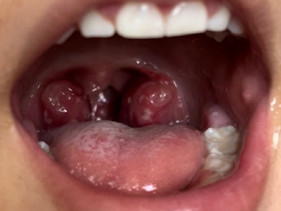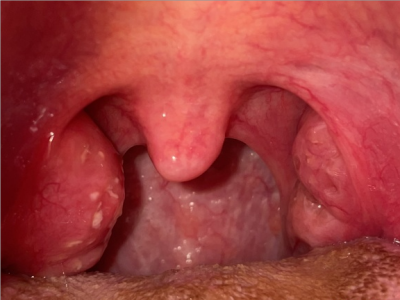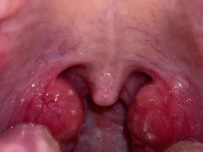 化脓性扁桃体炎扁桃体充血上面覆盖一层厚厚的白色脓苔图