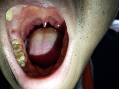 化脓性扁桃体炎一侧扁桃体多发大小不一的白斑图