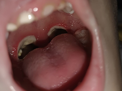 化脓性扁桃体炎儿童咽部两侧扁桃体红肿突出,占据咽部大部分空间,咽部变狭窄,红肿的黏膜表面有形状不规则的白斑,大小不一,部分融合成片,是化脓现象。