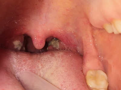 化脓性扁桃体炎患者的口咽右侧扁桃体发红,体积明显增大,造成口咽部位的空间减少,并伴有明显疼痛、灼烧感,从而影响吞咽动作。