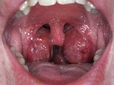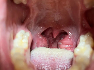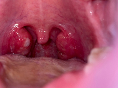 化脓性扁桃体炎患者口咽两侧的扁桃体肿大、发红,咽部充血、肿胀,肿大的扁桃体上面有黄白色脓点及脓苔,病变局部伴随疼痛、灼烧感。