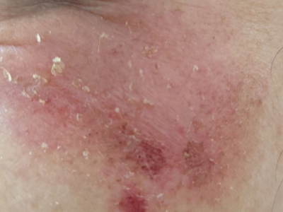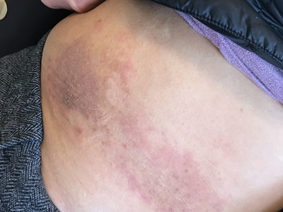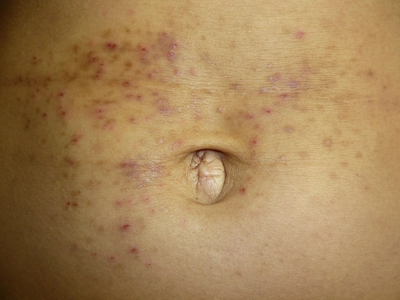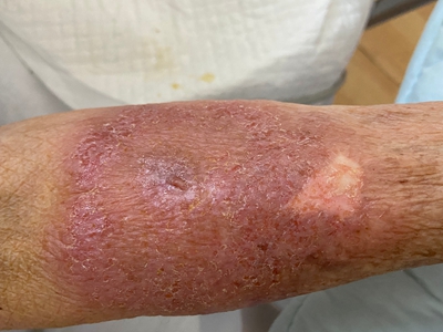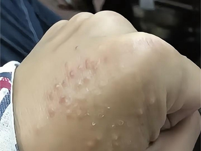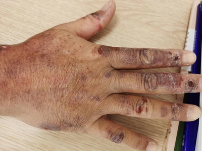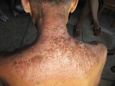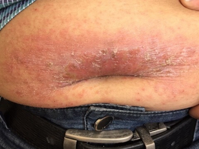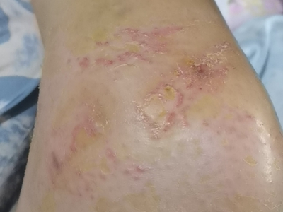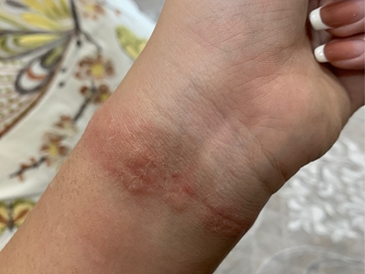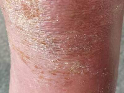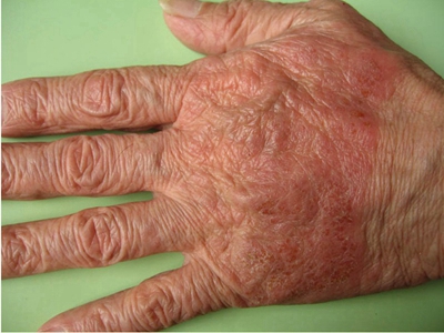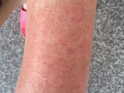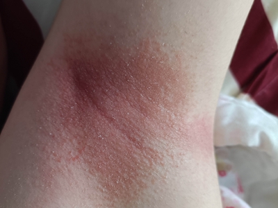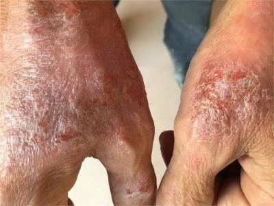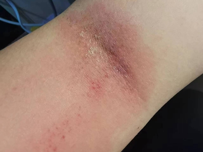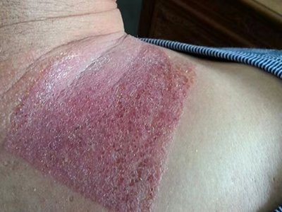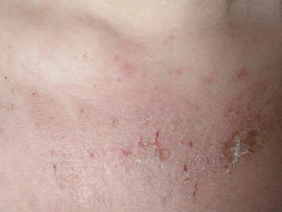 慢性接触性皮炎症状为慢性湿疹样改变,皮损轻度增生及苔藓样变,表现为皮肤粗糙、肥厚,并伴有红斑、黯沉、脱屑、糜烂、结痂等。病损可以发于手臂、小腿等处,患者自觉瘙痒,易引起搔抓。
