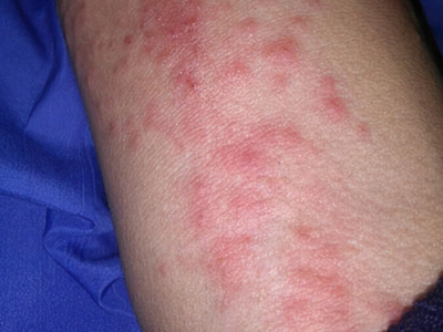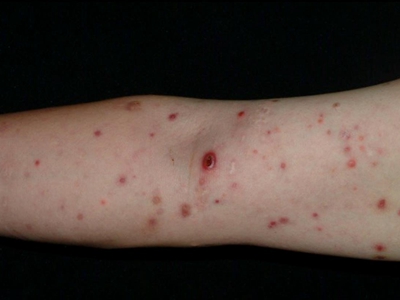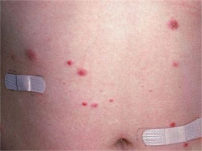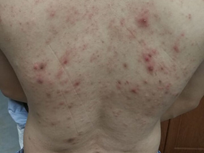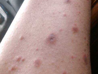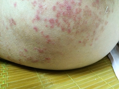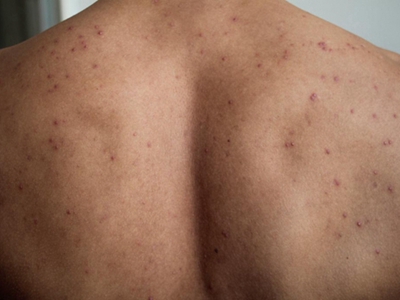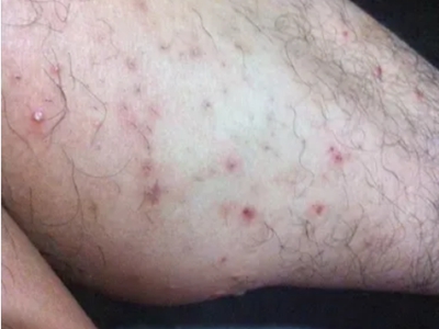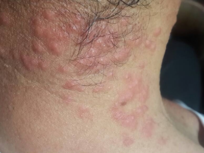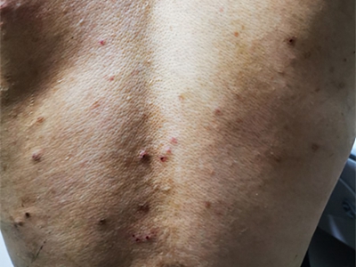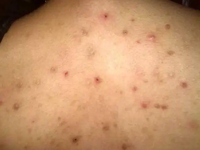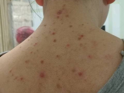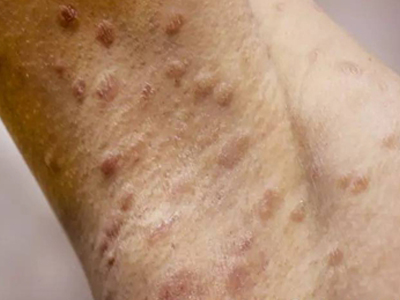 淋巴瘤样丘疹病的皮损呈多发性,颈部出现密密麻麻的红色结节,呈粟粒状至绿豆状大小,独立存在或相互融合成大块状,触摸皮肤粗糙不平。