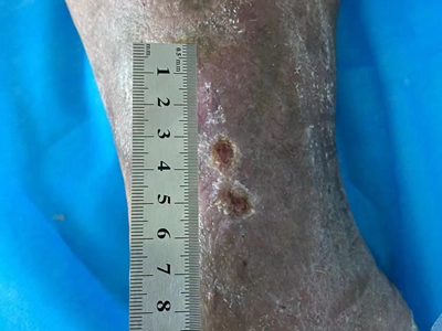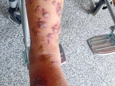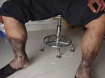 臁疮的脓疱随病程发展形成溃疡,皮肤表面出现多处瘢痕,患者脚背部分皮肤已经坏死,严重时可发展为急性肾炎、败血症、肺炎而死亡。