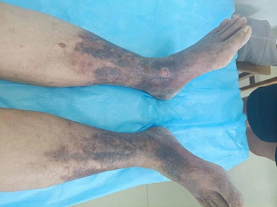 臁疮患者双侧小腿和脚背大面积出现褐色色素沉着,颜色分布不均匀,皮肤增厚,局部有明显的干燥裂纹,脚背有一硬币大小的溃疡,溃疡面颜色呈黄色。