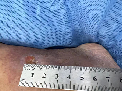 臁疮患者的脚踝上皮肤干燥角质化明显,同时有一大块皮肤溃烂,溃烂面中间鲜红,上面有数个小白斑。边缘有小黑点,主要是细菌感染导致的,此时应遵医嘱使用高锰酸钾溶液清洗湿敷,配合阿奇霉素片等药物治疗。