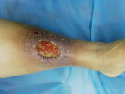 臁疮小腿上有一大块红色糜烂伤口图
