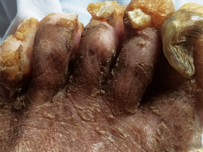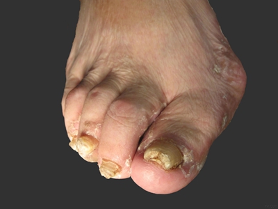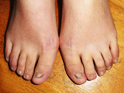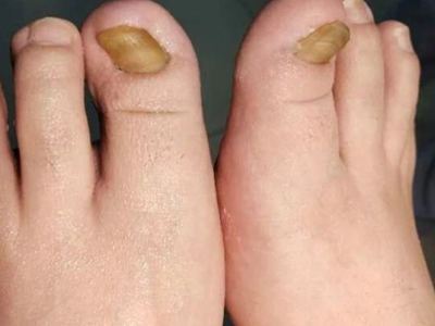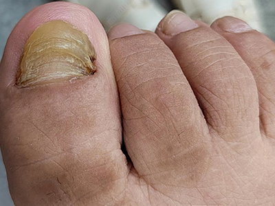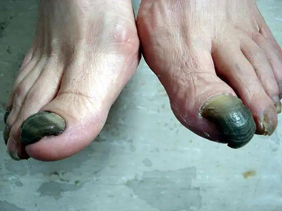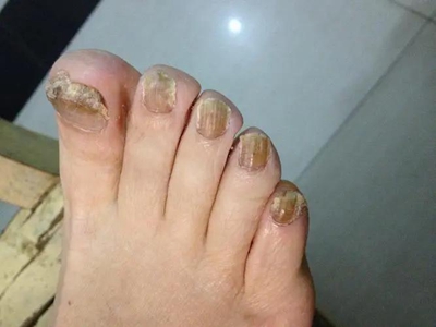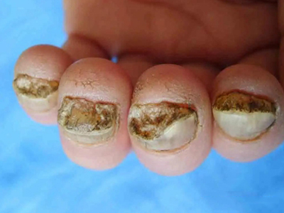 后天性厚甲症可发生于脚趾甲处,严重时会见到脚趾甲有明显增厚,整体变形,形状不规则,其中大脚趾趾甲扭曲形似葡萄干,其他四趾趾甲表面粗糙,凹凸不平,呈黄色及褐色。