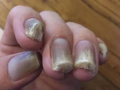 后天性厚甲症患者双手指甲出现增厚,前缘最为明显,颜色混浊发黑,表面没有光泽,粗糙且有颗粒感,且甲质硬脆,指甲的修剪极为困难。