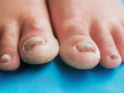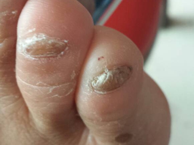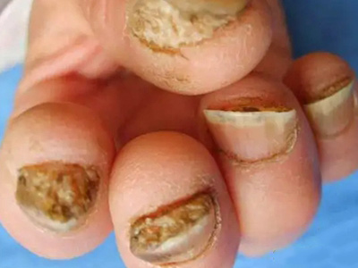 后天性厚甲症患者五个脚趾甲变厚发黄,趾甲前端会向上翘,触摸时可以感到硬脆,周围皮肤会有脱白皮的现象,并且会露出红润光滑的皮肤。