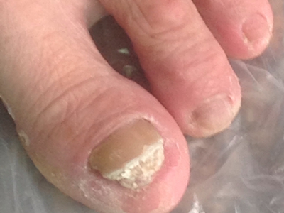 后天性厚甲症脚部趾甲增厚有白色渣样物质图