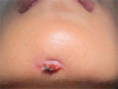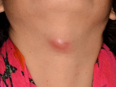 局限性口面部肉芽肿病患者脖子出现粉红色疙瘩,疙瘩顶端的皮肤明显发亮,触摸时有轻微的压痛,后期会出现溃疡或糜烂等情况,需积极进行治疗。