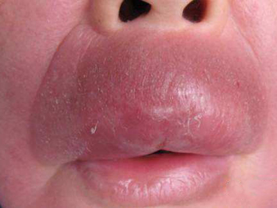 局限性口面部肉芽肿病会单独发生在上唇,患者上唇以及周围皮肤明显红肿,隆起明显,表面皮肤粗糙,有轻度的脱屑症状,触之有韧感。