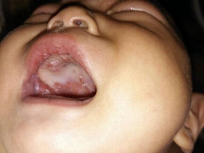 鹅口疮口腔咽部大量黄白色斑图