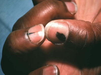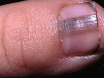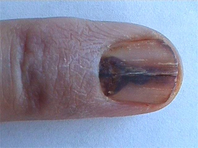 肢端雀斑痣样黑素瘤多由肢端雀斑样痣发展而来,好发于掌跖、甲及甲周区,皮损表现为色素不均匀、边界不规则的斑片,若位于甲母质,甲板及甲床可呈纵行带状色素条纹,进展快,常在短期内增大,发生溃疡和转移,存活率低。