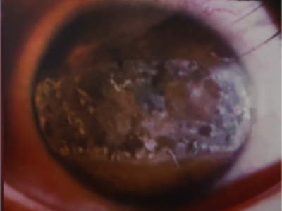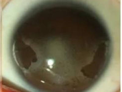 带状角膜病变患者黑眼球表面有三块白斑形成,颜色呈灰白色,其中一个位于瞳孔位置,另外两个分别位于角膜缘处,边界模糊,患者有视力下降、疼痛、流泪等症状。