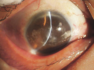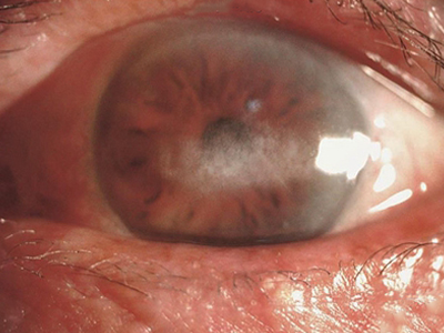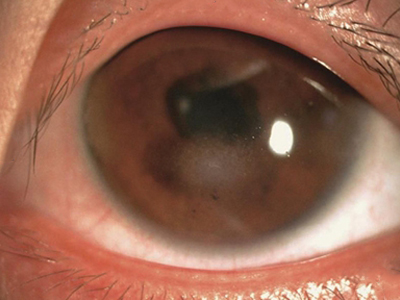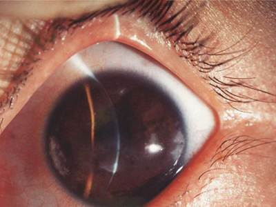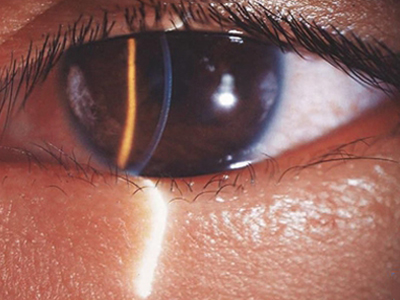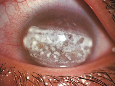 带状角膜病变会导致角膜的前弹力层出现钙质沉着斑块,像白斑一样,病变起始于睑裂区角膜边缘部,逐渐向中央发展,伴随眼睛异物、不适感。