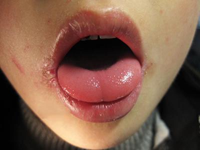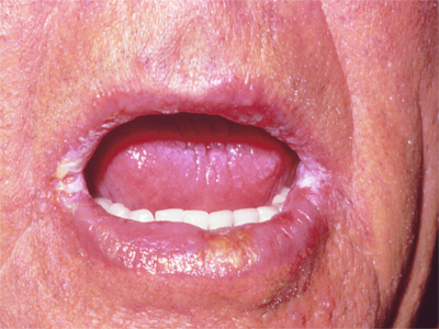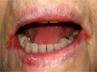 3、口角炎:口角有乳白色浸渍、糜烂、皲裂、痂皮、张口困难和疼痛,可继发念珠菌感染。