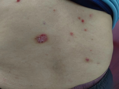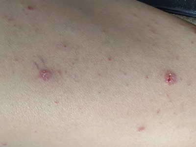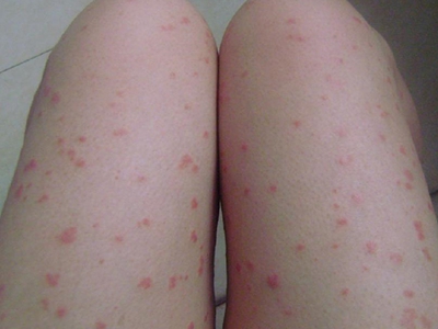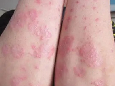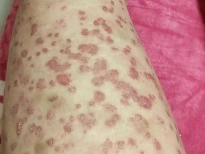 点滴型副银屑病患者双侧大腿出现密密麻麻的红色丘疹,数量多达数十个,皮损的边界清楚,散在分布,针头至黄豆大小,稍隆起于皮肤表面。