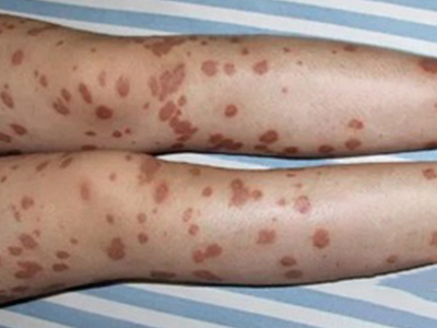 点滴型副银屑病患者在小腿上有较多散在分布的皮疹,皮疹消退后留有色素消退斑,表现为红褐色斑,形状为圆形或不规则样,大小不等,皮损常反复发生,多年不愈。