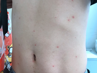 点滴型副银屑病的患者,在腹部出现散在分布的红斑,互相不融合,边界清晰,红斑上覆盖少量不容易掉落的细薄白色鳞屑,刮除后不易出血。