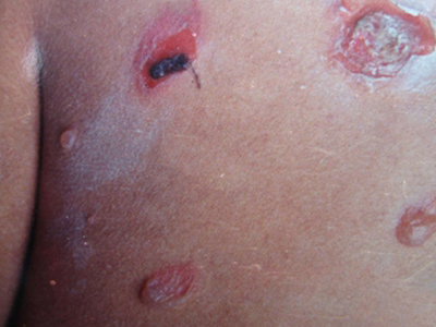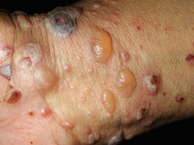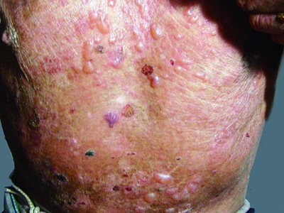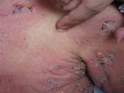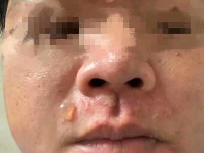 增殖型天疱疮患者的皮损最初为薄壁水疱,疱壁紧张,尼氏征阳性,破溃后很快形成肉芽,呈疣状或乳头瘤样增生,也有口腔黏膜损害,但出现较迟,疼痛明显。