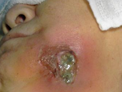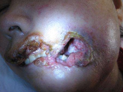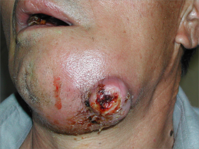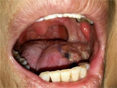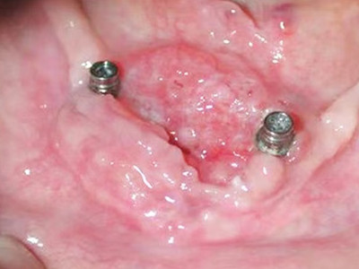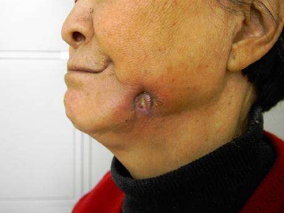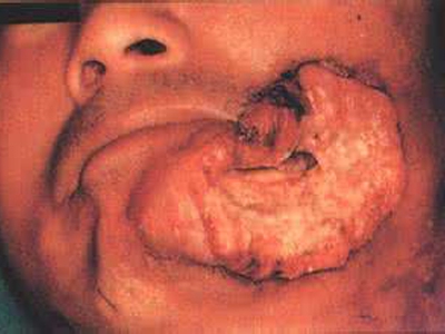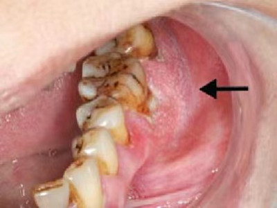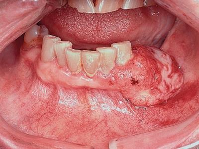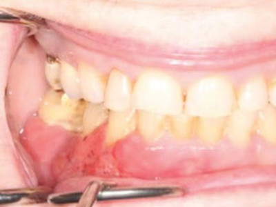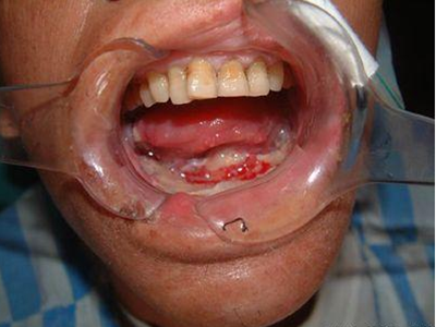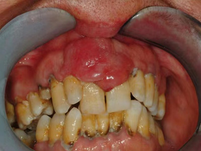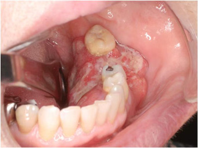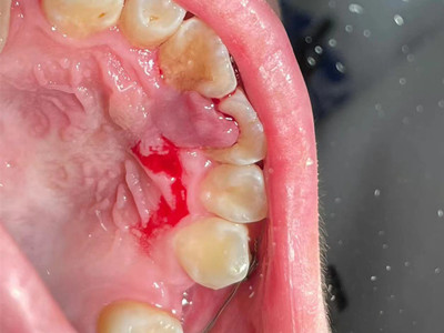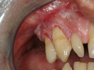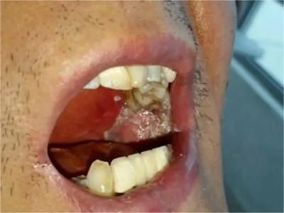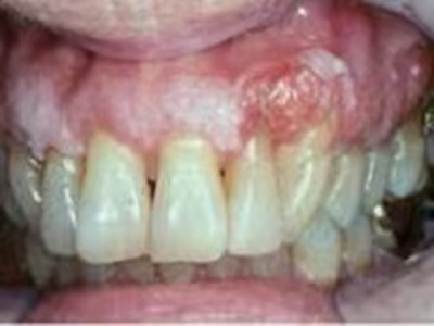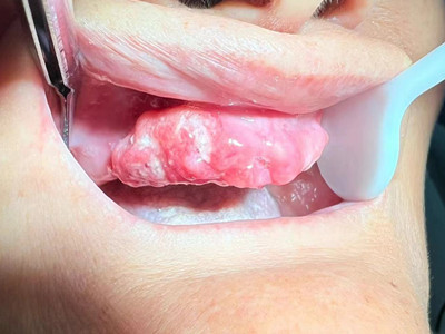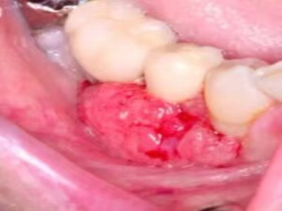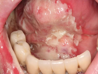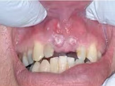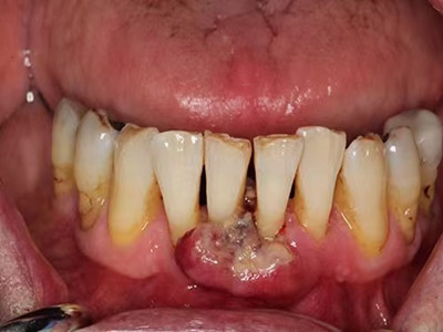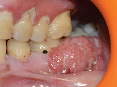 牙龈癌常发生继发感染,肿瘤伴以坏死组织,触之易出血。体积过大时可出现面部肿胀,浸润皮肤。