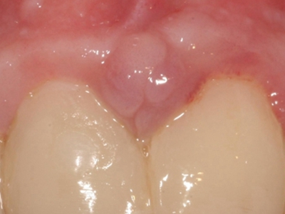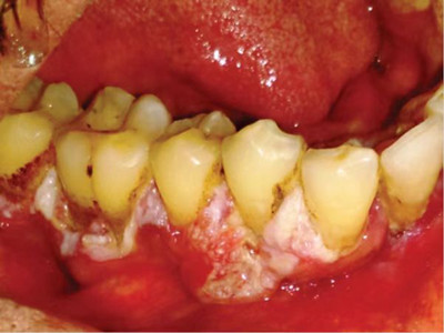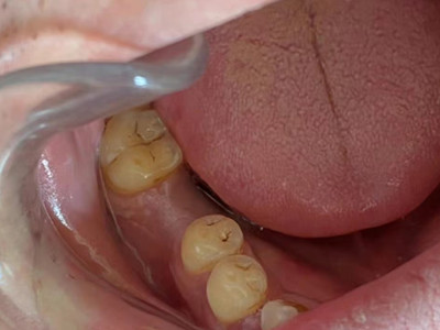 牙龈癌多源于牙间乳头及龈缘区,溃疡呈表浅、淡红,以后可出现增生。由于黏骨膜与牙槽突附着甚紧,较易早期侵犯牙槽突骨膜及骨质,进而出现牙松动,并可发生脱落。X线片可出现恶性肿瘤的破坏特征虫蚀状不规则吸收。